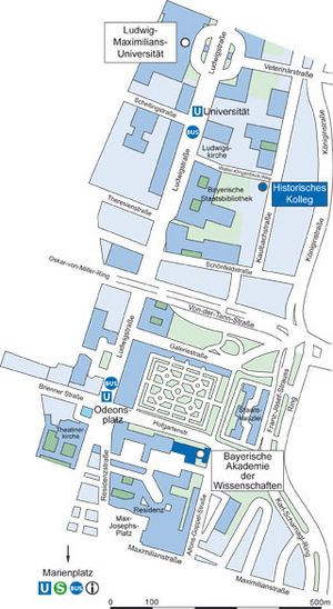 The Historisches Kolleg is located in Munich’s Maxvorstadt district between the Bavarian State Library and the English Garden. The Kolleg at Kaulbachstraße 15 is a five-minute walk from the Universität stop (subway lines 3 and 6; bus lines 58, 68, 153, and 154). The Odeonsplatz stop (subway lines 3, 4, 5, and 6; bus lines 100 and 153) is a ten-minute walk away.